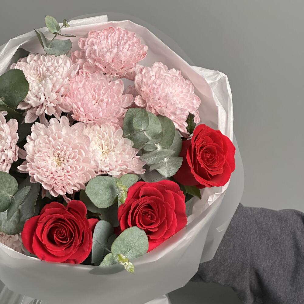 Хризантема кустовая - 2 шт. Эвкалипт - 1 шт. Роза Эквадор - 3 шт. Открыточка с вашими пожеланиями - 1 шт. Дизайнерская упаковка - 1 шт.